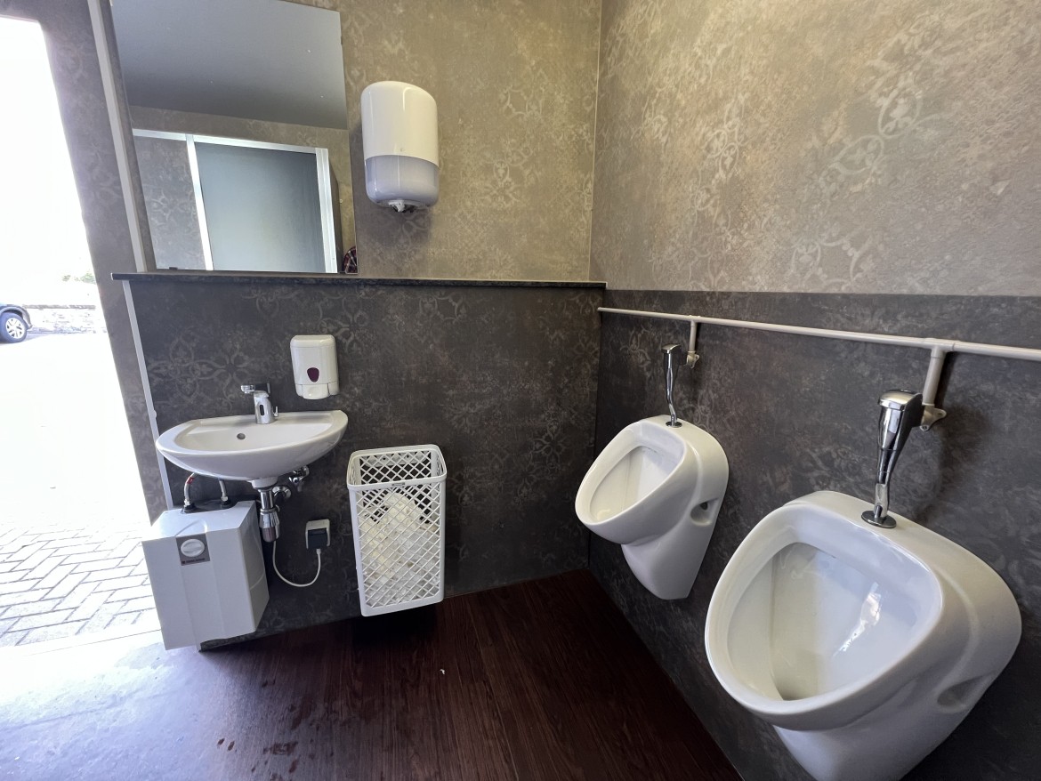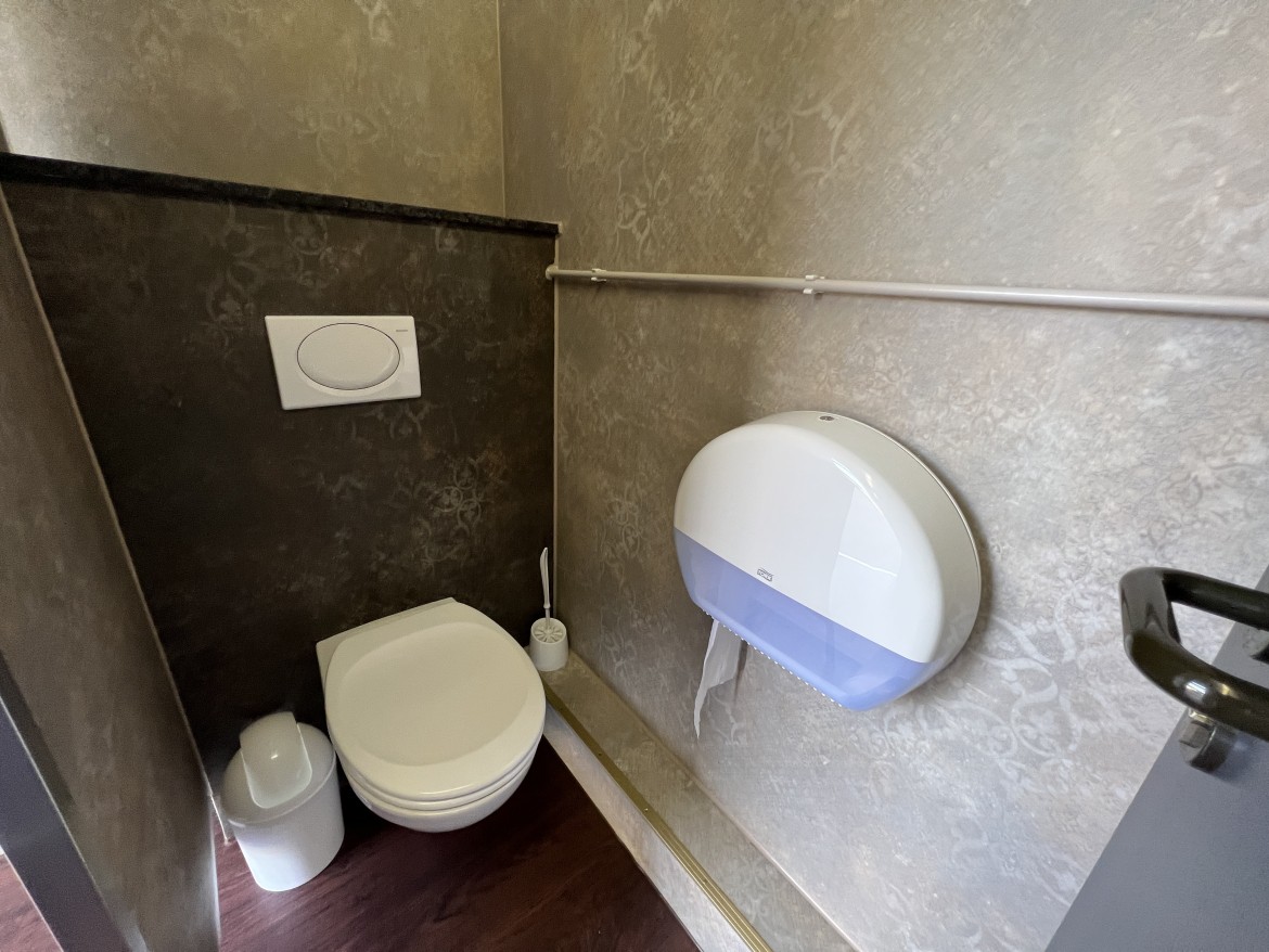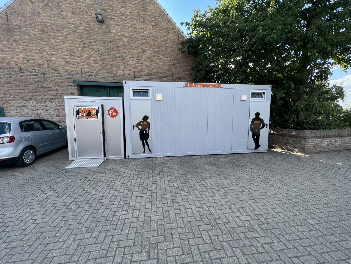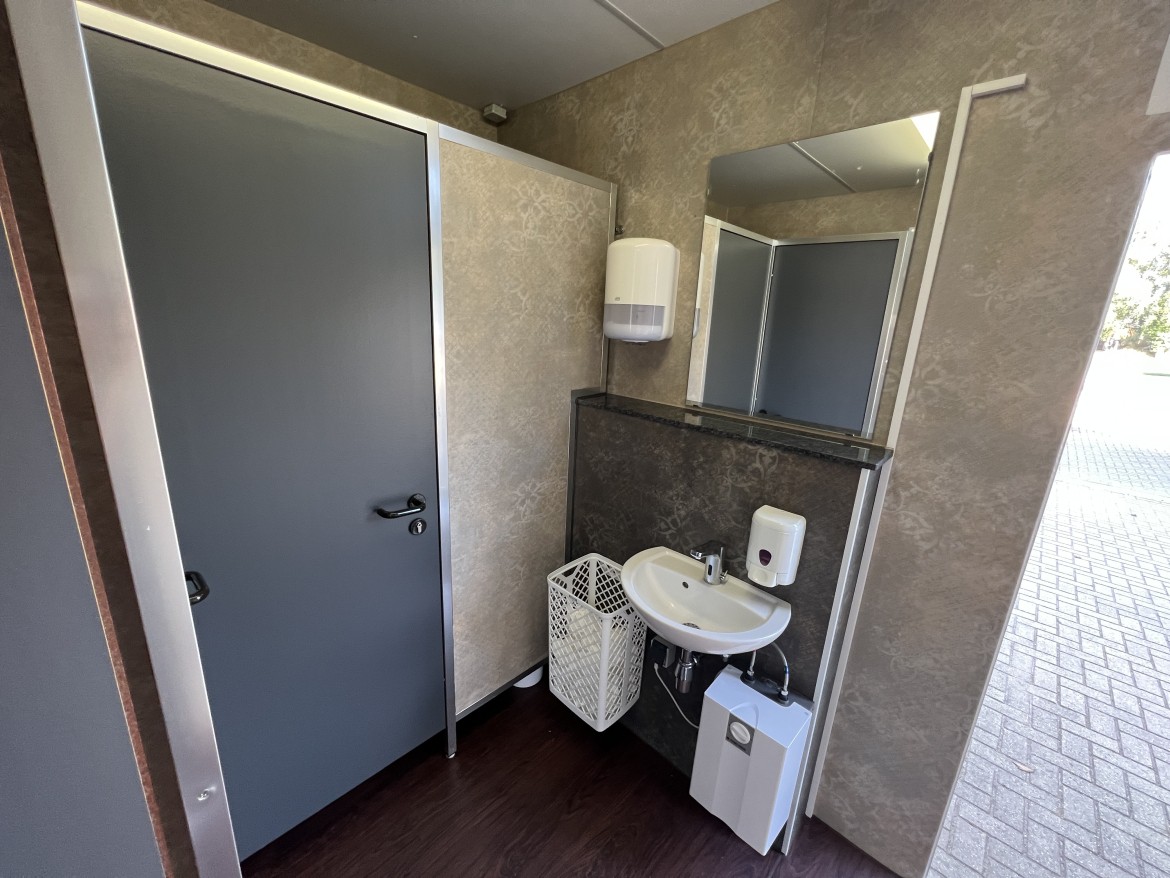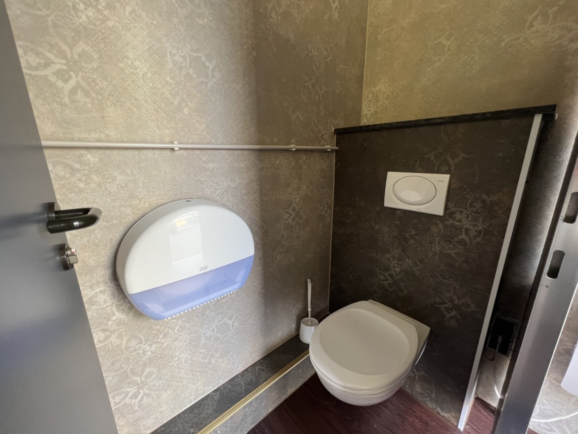 Unser WC-Container C05 ist barrierefrei. Weiterhin verfügt der WC Container einen ausklappbaren Wickeltisch