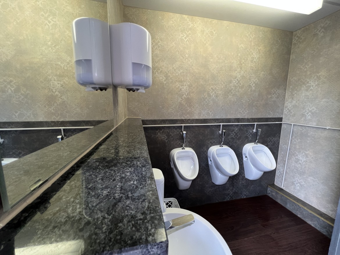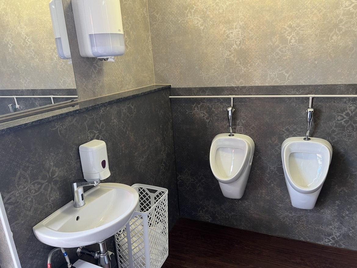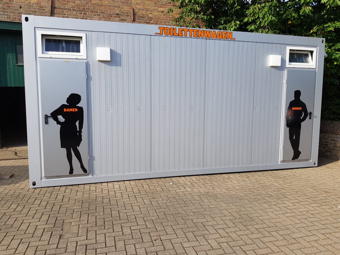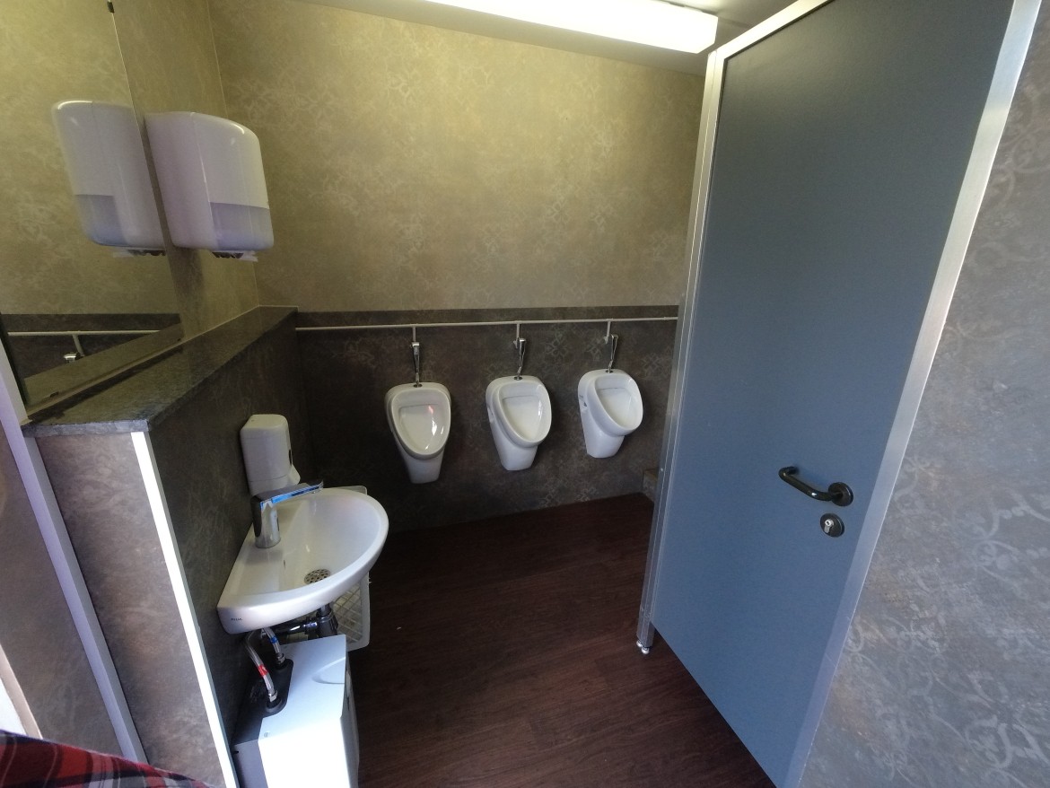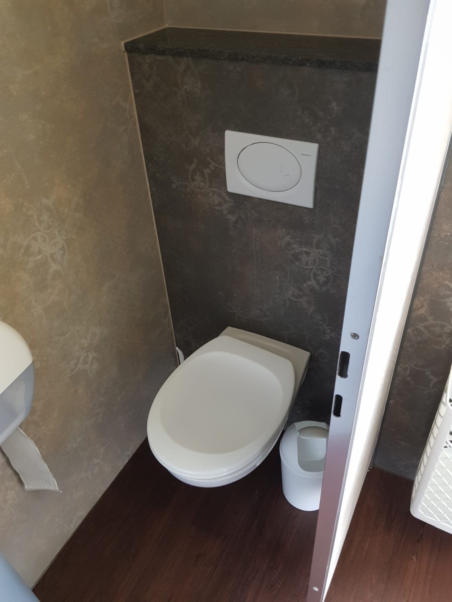 Unser WC-Container C05 ist barrierefrei. Weiterhin verfügt der WC Container einen ausklappbaren Wickeltisch